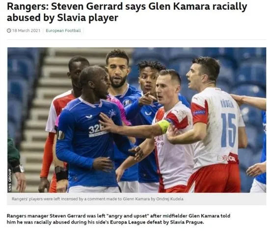 UEFA Avrupa Ligi'nde dün akşam oynanan Glasgow Rangers-Slavia Prag maçında ırkçılık skandalı yaşandı. Slavia Prag'ın 2-0 üstünlüğüyle sona eren karşılaşma sonrası açıklamalarda bulunan Glasgow Rangers Teknik Direktörü Steven Gerrard, oyuncusu Glen Kamara'nın, maç sırasında tartıştığı Ondrej Kudela tarafından ırkçı sözlere maruz kaldığını söyledi.