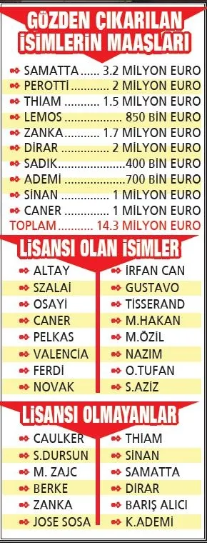 Lisansı olan isimlerden biri de kadro dışı kalan Caner. 10 gün sonra A.Demir ile karşılaşacak olan Fener'de Samatta'nın 6 milyon Euro'luk zorunlu opsiyonun devreye girişi de işleri zorlaştırıyor.