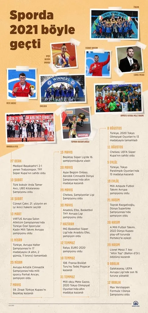 Tüm dünyayı saran Kovid-19 pandemisi nedeniyle 2020'deki pek çok spor organizasyonu 2021 yılına ertelenmişti. Bu durum 2021'in spor gündeminin hayli hareketli geçmesine neden oldun. 2021 yılına ertelenen 16. Avrupa Futbol Şampiyonası ve 2020 Tokyo Olimpiyatları başı çekiyor. 2020 Tokyo'da Mete Gazoz, Busenaz Sürmeneli gibi sporcular göğsümüzü kabartırken, Toprak Razgatlıoğlu 2021 Superbike Şampiyonu oldu ve tarihe geçti. Öte yandan Formula 1 yeniden Türkiye'deydi. Sporun birçok dalından yılın en önemli organizasyonlarını derledik. İşte 2021'de spor dünyasın yaşananlar. / Songül Soysal