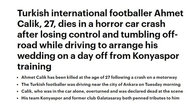 Konyaspor'un 28 yaşındaki futbolcusu Ahmet Çalık, trafik kazasında hayatını kaybetti. Bir dönem Galatasaray'da da forma giyen Çalık'ın kullandığı araç, Ankara-Niğde yolunda kontrolden çıkıp, şarampole devrildi. Sağlık görevlilerince yapılan kontrolde, araçta yalnız olan Ahmet Çalık'ın yaşamını yitirdiği belirlendi. Dünya futbolu Ahmet Çalık'ın ölümünü manşetlerden verdiler. Büyük kulüpler Çalık için taziye mesajı yayınladı.