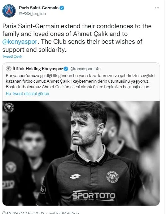Fransız kulübü Paris Saint-Germain (PSG), trafik kazasında yaşamını yitiren İttifak Holding Konyasporlu futbolcu Ahmet Çalık için taziye mesajı yayımladı.
