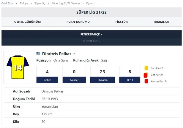 Dimitrios Pelkas bir sezon önce ise Fenerbahçe formasıyla 42 maçta 10 gol atarken 8 asist yaptı. 18 gole katkıda bulundu. Yunan yıldız, 26 kez milli formayı giyerken 1 gol kaydetti. Pelkas'ın ismi Yunan kulüpleriyle de anılıyor.