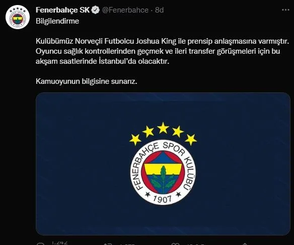 Sarı-lacivertli ekipten konuyla ilgili yapılan açıklamada, "Kulübümüz Norveçli Futbolcu Joshua King ile prensip anlaşmasına varmıştır. Oyuncu sağlık kontrollerinden geçmek ve ileri transfer görüşmeleri için bu akşam saatlerinde İstanbul'da olacaktır" ifadeleri kullanıldı.