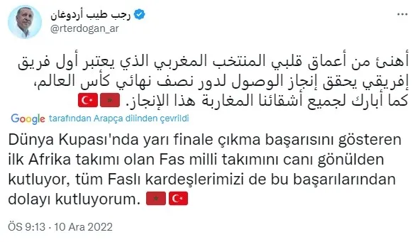 Erdoğan, Twitter hesabından yaptığı paylaşımda, "Dünya Kupası'nda yarı finale çıkma başarısını gösteren ilk Afrika takımı olan Fas Milli Takımı'nı canıgönülden kutluyor, tüm Faslı kardeşlerimizi de bu başarılarından dolayı kutluyorum." ifadelerini kullandı.