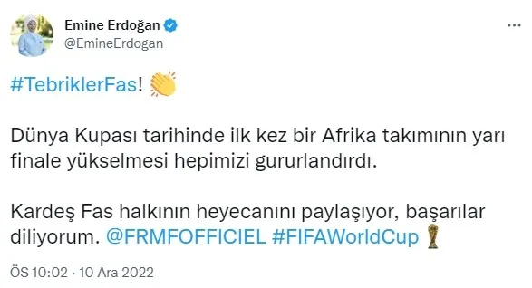Başkan Erdoğan'ın Emine Erdoğan da, Twitter hesabından yaptığı paylaşımda, "Tebrikler Fas! Dünya Kupası tarihinde ilk kez bir Afrika takımının yarı finale yükselmesi hepimizi gururlandırdı. Kardeş Fas halkının heyecanını paylaşıyor, başarılar diliyorum." ifadelerini kullandı.