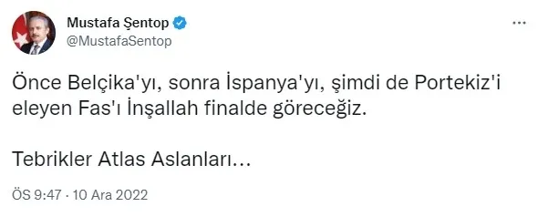 TBMM Başkanı Mustafa Şentop sosyal medya hesabından yaptığı paylaşımda, "Önce Belçika'yı, sonra İspanya'yı, şimdi de Portekiz'i eleyen Fas'ı inşallah finalde göreceğiz. Tebrikler Atlas Aslanları." ifadelerini kullandı.