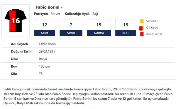 İtalyan golcü Fabio Borini, İngiltere Premier Lig devi Chelsea'nin yanı sıra sırasıyla Parma, Roma, Liverpool, Sunderland, Milan ve Hellas Verona formalarını giymişti. Borini kariyeri adına ise en golcü sezonu Karagümrük'te yaşıyor.