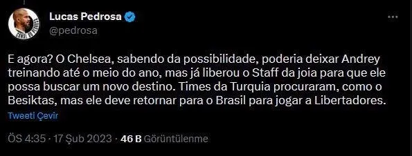 Beşiktaş'la transferde adı anılan isimler arasında Karagümrük forması giyen Fabio Borini ve Roma'da oynayan El Shaarawy yer alıyor. Siyah-Beyazlılar bu isimlerle ilgili çalışmalarını sürdürürken gündeme bomba biri isim geldi. Kartal, İngiltere Premier Lig ekiplerinden Chelsea'de forma giyen genç yetenek Andrey Santos'u kiralık olarak kadrosuna katmak için yoğun bir mesai harcıyor.