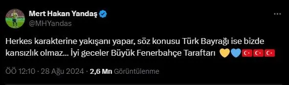 Mert Hakan yaptığı paylaşımda, ''Herkes karakterine yakışanı yapar, söz konusu Türk Bayrağı ise bizde kansızlık olmaz… İyi geceler Büyük Fenerbahçe Taraftarı'' ifadelerini kullandı.