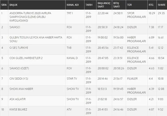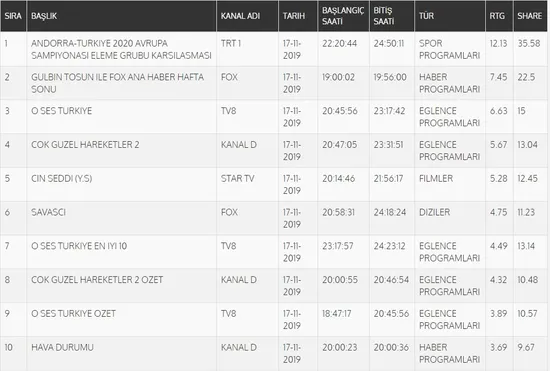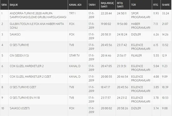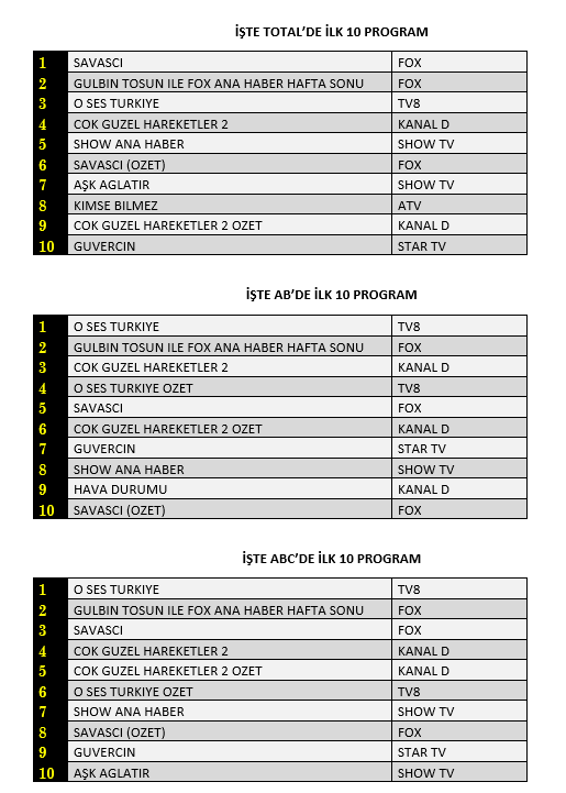 Total'de 1.sırada Fox TV'de yayınlanan "Savaşçı", 2.sırada "Gülbin Tosun ile Fox Ana Haber Hafta Sonu", 3.sırada tv8'de ekrana gelen "O Ses Türkiye" yer aldı. AB'de ise 1.sırada tv8'de yayınlanan "O Ses Türkiye", 2.sırada "Gülbin Tosun ile Fox Ana Haber Hafta Sonu", 3.sırada Kanal D'de ekrana gelen "Çok Güzel Hareketler 2" yer aldı.