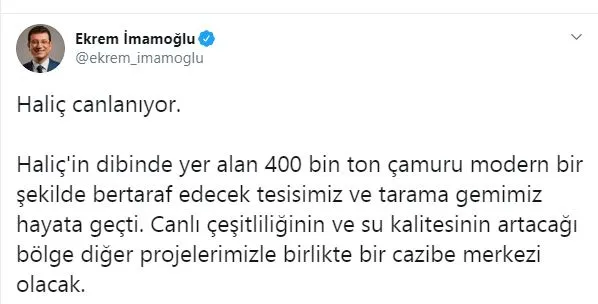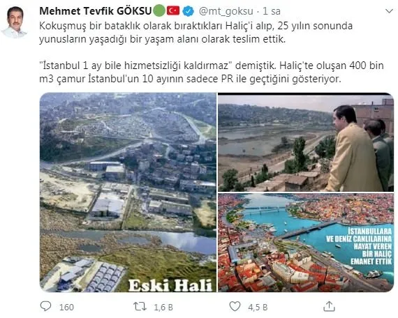 İmamoğlu, Haliç'in kendi dönemlerinde temizlendiği algısını yaparak sosyal medya hesabından tepki çeken paylaşımlarda bulundu. Ancak gerçekler çok geçmeden ortaya çıktı. A Haber canlı yayınına katılan İBB AK Parti Grup Başkanvekili M. Tevfik Göksu, “Haliç'in dibinde çamur biriktiğini onu çamur yakma tesisiyle temizleyeceklerini iddia ediyorlar. Bir: Burada sözünü ettikleri çamur yakma tesisini biz kurduk. İki: Orada birikti dediğiniz çamur sizin çamurunuz. Beceremediğiniz, yönetemediğiniz, 10 ayda Haliç'in dibine birikmiş çamur. Ve siz bu pisliği yine bizim kurduğumuz tesis ile temizleyeceksiniz.” dedi.