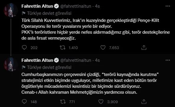 Altun, sosyal medya hesabından, Türk Silahlı Kuvvetlerinin (TSK) Irak'ın kuzeyinde Metina, Zap ve Avaşin-Basyan bölgelerindeki terörist hedeflere yönelik başlattığı Pençe Kilit Operasyonu'na ilişkin açıklama yaptı.