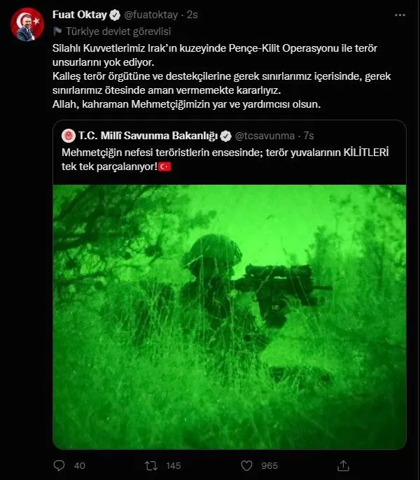 Oktay, sosyal medya hesabından, Türk Silahlı Kuvvetlerinin (TSK) Irak'ın kuzeyinde Metina, Zap ve Avaşin-Basyan bölgelerindeki terörist hedeflere yönelik başlattığı Pençe Kilit Operasyonu'na ilişkin açıklama yaptı.
