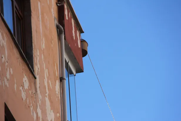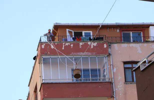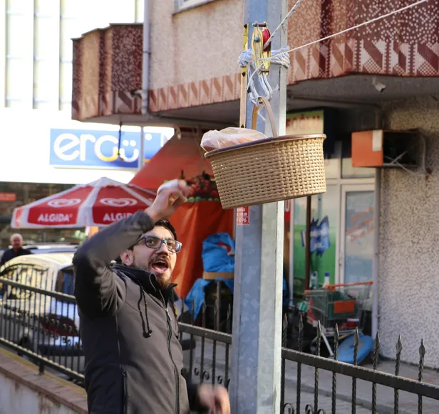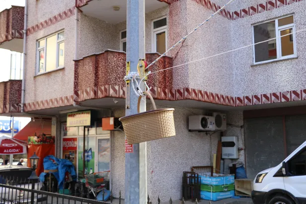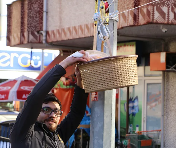 Telefon ile markettekileri arayıp ihtiyaçlarını bildiren Gökdemir, parayı sepete koyup marketteki görevliye gönderiyor, ardından sepete konan malzemeleri iple balkona çekiyor.