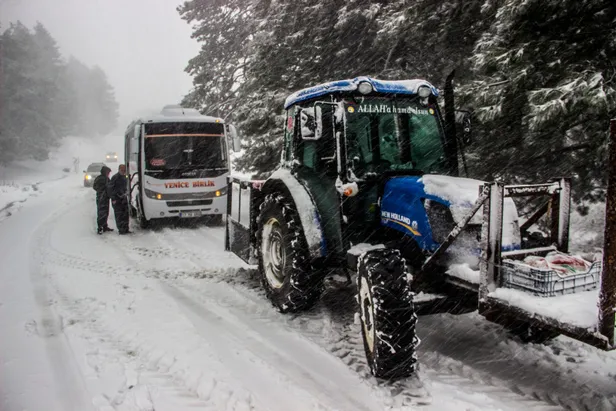 Yolda kar yağışı nedeniyle mahsur kalanları orman köylüleri dört çeker traktörleri ile kurtardı.