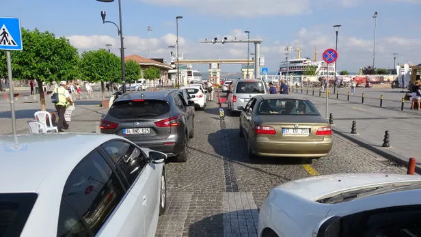 Bayramın son günüyle beraber dönüş hazırlığına başlayan tatilciler, Çanakkale İskelesi'nden Eceabat ve Kilitbahir İskelesi'ne ulaşmak için bunaltıcı sıcak altında bekleyişlerini sürdürüyor.