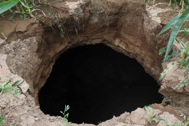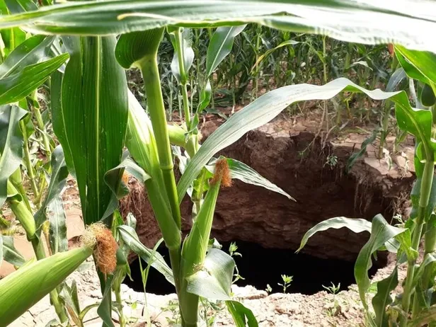 Konya’da bir mısır tarlasında 3 metre genişliğinde yaklaşık 10 metre derinliğinde oluşan obruk çiftçileri korkuttu. Olay yerine gelen köylüler neye uğradığını şaşırırken, telefonlar ile obruğu görüntüledi.