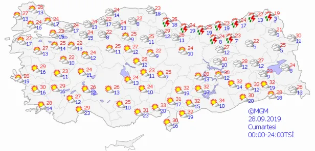 Eylül ayının son günlerine yaklaştığımız şu günlerde hava sıcaklıklarında belirgin bir şekilde düşüş yaşanıyor. Bu nedenle vatandaşlar Meteoroloji tarafından yapılacak uyarıları yakından takip ediyor. Yapılan son uyarıya göre Marmara, Ege, Batı Akdeniz, İç Anadolu ile Batı ve Orta Karadeniz'de yarın aralıklı ve gök gürültülü sağanak bekleniyor. Meteoroloji yaptığı uyarıda oluşabilecek ani sel, su baskını ve yıldırım tehlikesine karşı vatandaşların tedbirli olmasını istedi. Peki, yarın hava nasıl olacak? İşte Türkiye geneli hava durumu raporu...
