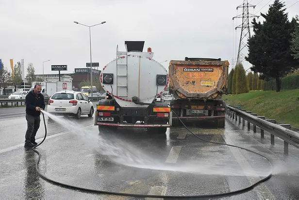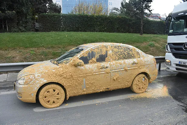 O sırada kamyonda bulunan yağmur nedeniyle çamurlaşmış toprak aynı istikamette ilerleyen Zeki Erdem yönetimindeki 34 AG 0465 plakalı otomobilin üzerine ve yola döküldü. Camı açık olan otomobilin ve sürücüsünün üstü çamur oldu.