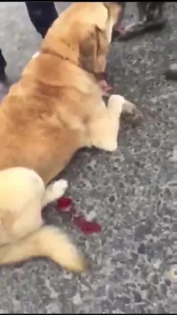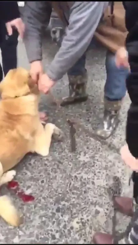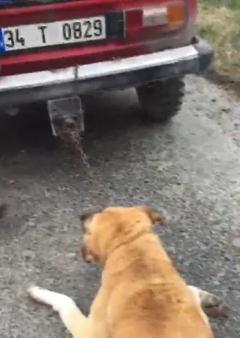 Görüntüde yerde sürüklenen köpeğin ayaklarının metrelerce sürüklenmesinin etkisiyle kanadığı görülüyor.
