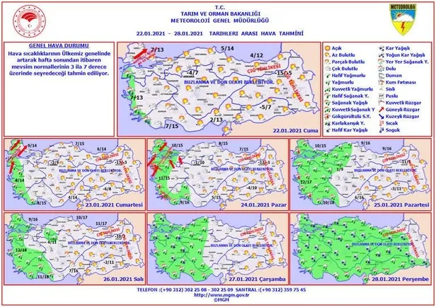 Meteoroloji Genel Müdürlüğü tarafından yayımlanan haftalık hava durumu (22 - 28 Ocak 2021) verilerine göre;