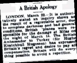 İngiltere'nin Ankara Büyükelçisi o yılların önemli diplomatı Sir Huge Knatchbull-Hugessen'i Alman işgali altındaki Rodos'u bombalamak isterken çok karanlık bir gece olduğundan ve navigatör hatası yüzünden Milas'ı bombaladıklarını söyledi ve 23 Mart'ta resmi olarak özür diledi. Bekçi Dursun evine düşen bir bomba sonucu ölmüş, hamile karısı ise yaralanmıştı.