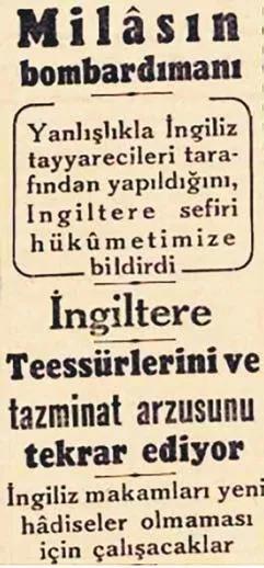 15 Mart 1942 Saat 00:55'te üç İngiliz uçağı Milas'ı bombaladı. Kısa süren bombalamada, bombaların bir kısmı şehrin içine bir kısmı da şehrin etrafındaki tarlalara düştü. Tarlalar yeni sürüldüğü için düşen bombaların bir kısmı patlamamıştı. Milas'ın içine ise 15 bomba düştü ve sonra da makineli tüfeklerle taranmıştı. İki ülke arasında diplomatik kriz yaşandı.