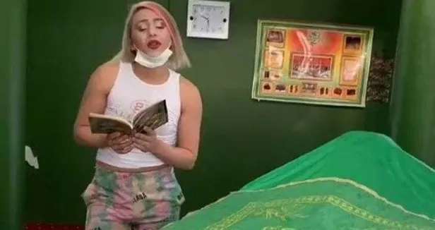Görüntülerde açık kıyafetlerle türbeye giren şahsın elinde bir de dua kitabı olduğu görüldü. Daha sonra farklı mimikler yaparak arka planda duyulan Arapça ilahiye eşlik eden Şeker, türbeyi eğilerek öptü.