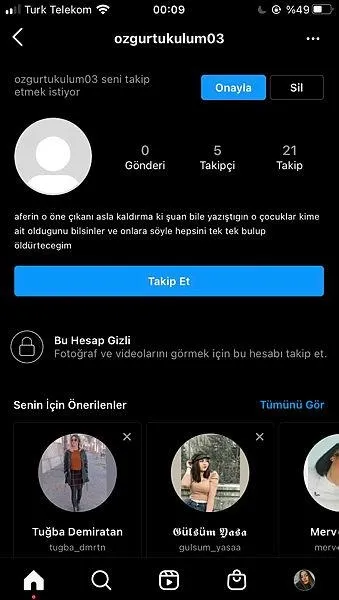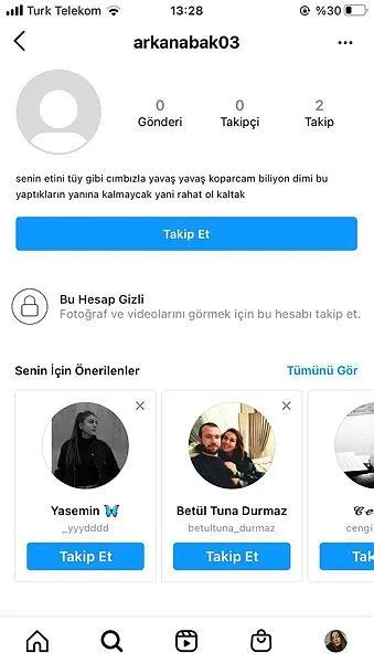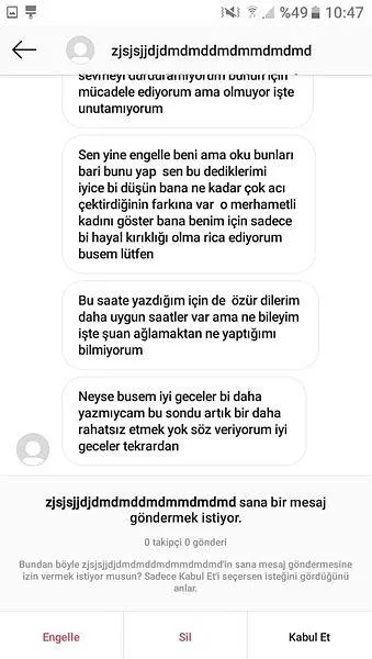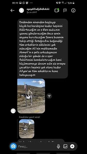 Son dakika haberi... Afyon'da üniversite okuyan Buse Dönmez'in hayatı 4 senedir kabusa dönmüş durumda. Genç kızı, hayatında hiç görmediği adını dahi bilmediği Azad E. isimli bir psikopat Özgecan Aslan, Emine Bulut gibi yaşamını yitirmiş kadınlarla tehdit etti. Talihsiz kadın defalarca telefon numarasını değiştirdi ve sosyal medya hesaplarını değiştirdi. Fakat psikopat peşini bırakmadı.