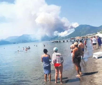 Saat 10:00'da başlayan yangını, sahildeki turistler de böyle izledi.
