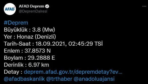 AFAD verilerine göre; 2.45'te merkez üssü Denizli'nin Honaz ilçesinde 3.8 büyüklüğünde bir deprem meydana geldi. Depremin derinliği ise 6,97 kilometre olarak açıklandı.