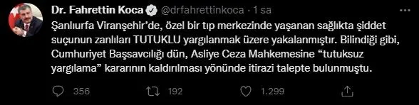 Koca, Twitter hesabından, "Şanlıurfa Viranşehir'de, özel bir tıp merkezinde yaşanan sağlıkta şiddet suçunun zanlıları TUTUKLU yargılanmak üzere yakalanmıştır. Bilindiği gibi, Cumhuriyet Başsavcılığı dün, Asliye Ceza Mahkemesine "tutuksuz yargılama" kararının kaldırılması yönünde itirazi talepte bulunmuştu." paylaşımında bulundu.