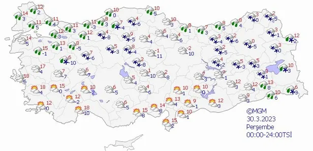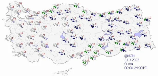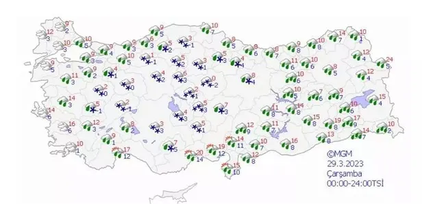 Yurt genelinin parçalı ve çok bulutlu, Marmara, Doğu Akdeniz, İç Anadolu'nun kuzeybatısı, Karadeniz, Doğu ve Güneydoğu Anadolu ile Afyonkarahisar, Kütahya, Sivas çevrelerinin yağmur ve sağanak yağışlı, Doğu Karadeniz'in iç kesimleri ile Doğu Anadolu'nun kuzey ve doğusunun yükseklerinin karla karışık yağmurlu geçeceği tahmin ediliyor.