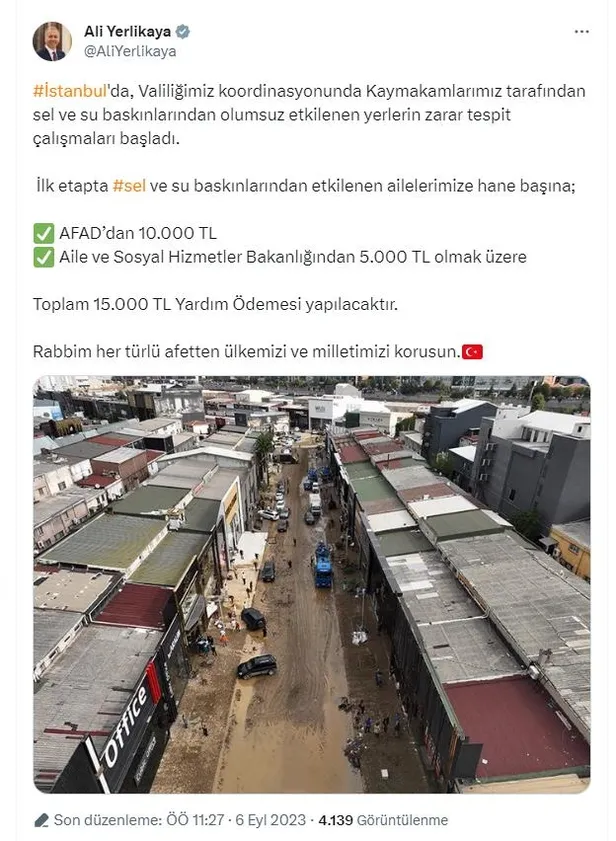 İçişleri Bakanı Ali Yerlikaya, "İstanbul'da, Valiliğimiz koordinasyonunda Kaymakamlarımız tarafından sel ve su baskınlarından olumsuz etkilenen yerlerin zarar tespit çalışmaları başladı" ifadelerini kullandı.