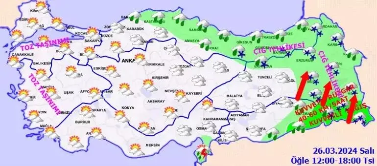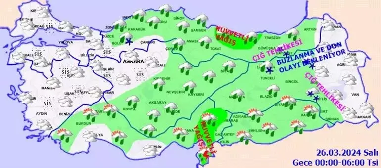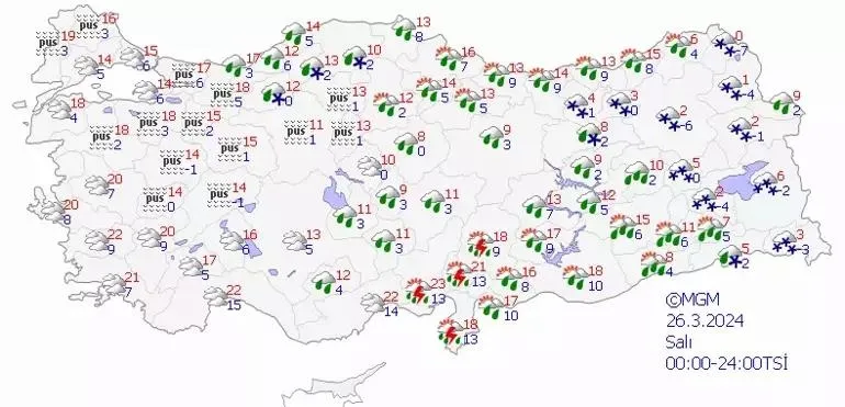 Meteoroloji Genel Müdürlüğü son dakika hava durumu tahminlerini paylaştı.Meteoroloji Genel Müdürlüğü'nün son hava durumu değerlendirmelerine göre bugün Hatay, Osmaniye, Kahramanmaraş, Ordu, Giresun, Bingöl ve Muş çevrelerinde kuvvetli sağanak görülecek. Batı ve Doğu Karadeniz’in iç kesimleri ile Doğu Anadolu’nun kuzey ve doğusunda da karla karışık yağmur ve kar bekleniyor. Peki, bugün hava nasıl olacak? İşte, İstanbul, Ankara, İzmir ve il il 26 Mart hava durumu raporu.