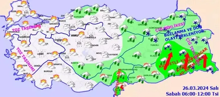 Bu sabah ve gece saatlerinde Marmara ve İç Ege ile İç Anadolu'nun kuzeybatısında yer yer pus ve sis, doğu kesimlerde buzlanma ve don olayı bekleniyor. Marmara ve Ege'de toz taşınımı bekleniyor. Doğu Karadeniz'in iç kesimleri ile Doğu Anadolu'nun kuzey ve doğusunda çığ tehlikesi bulunmaktadır.