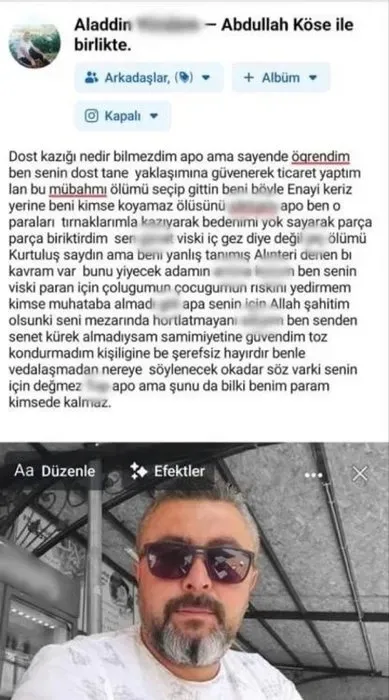 İntihar ederek yaşamına son veren Abdullah Köse'ye ticari amaçlı yaklaşık 400 bin lira borç veren Aladdin Yöndem, Abdullah Köse'nin ölmesi üzerine parasını alamayınca ödeme günü olan 20 Nisan tarihi akşam saatlerinde adamın mezarı başına gitti. Ervah Kabristanlığındaki Köse'nin mezarı başında önce mezarla konuşmaya başlayan Aladdin Yöndem, bir süre sonra adeta çılgına dönerek ölen borçlusuna hakaretler edip küfürler yağdırdı.
