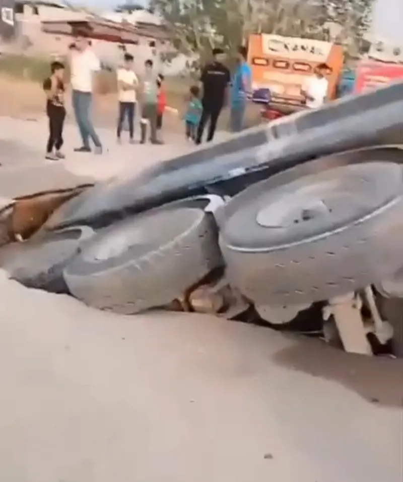 Kamyonun sürücüsü her ne kadar manevra yapsa da kamyon, yolda oluşan çukura düştü.