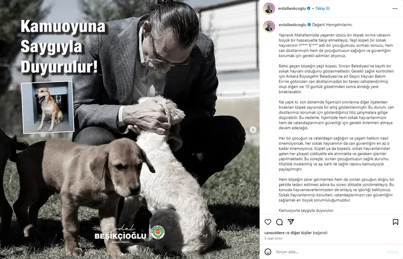 Etimesgut Belediye Başkanı Erdal Beşikçioğlu, sosyal medya hesabından yaptığı açıklamada, Ankara'nın Etimesgut ilçesi Yapracık Mahallesi'nde yaşanan köpek ısırma vakasını büyük bir hassasiyetle takip ettiğini belirtti.