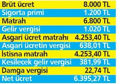 Örneğin; bir işçinin brüt maaşı 8.000 TL olsun. Bu işçi asgari ücretin üzerinde maaş almaktadır. Ancak ücretinde asgari ücret kadar kısım vergiden istisna tutulacaktır. Bu işçinin Ocak maaşı şöyle hesaplanacaktır: