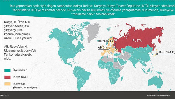 AA muhabirinin DTÖ verilerinden derlediği bilgilere göre, Türk menşeli ürünlerin ithalatına dönük yaptırımlar ile gümrüklerde ürünlerin gereğinden uzun süre bekletilmesi nedeniyle doğan zararlardan dolayı Türkiye, Rusya'yı DTÖ anlaşmaları, Ticaret ve Tarifeler Genel Anlaşması (GATT) ile Hizmet Ticareti Genel Anlaşması (GATS) hükümleri kapsamında DTÖ'ye şikayet edebilecek. Böyle bir durumda konu DTÖ'nün Anlaşmazlıkların Halli Mekanizması'nda (AHM) ele alınacak.