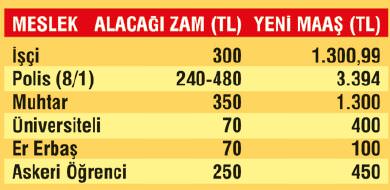 Hükümet, zam müjdelerini birbiri ardına hayata geçiriyor. Asgari ücretin net bin 300 liraya çıkmasından sonra, sadece işçilerin değil birçok meslek grubunun maaşlarına ve ödeneklerine zam geldi. Söz konusu yasa tasarıları da Meclis'te birer birer çıkmaya başladı. Üniversite öğrencilerinin bursları 400 liraya yükseltilirken muhtarlara da 350 liralık artış geldi. Polislerin ise emniyet hizmeti tazminatı yüzde 25 oranında artırılırken maaşlara 480 lirayı bulan zamlar yansıyacak. Bunun yanında er ve erbaşların harçlıkları artarken polis ve astsubayların göstergelerinin yükseltilmesi de maaş ve emekli ikramiyelerine olumlu yansıyacak.