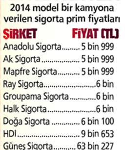 Sigorta şirketlerinin aynı araç için belirlediği farklı zorunlu trafik sigortası fiyatları şaşırttı. Dudak uçuklatan fiyat farkları, araç sahiplerini bezdirdi. Öyle ki; bir kamyon için bir firma 6 bin lira, başka bir firma ise 63 bin lira istedi. İstanbul'da Beylikdüzü Belediyesi'ne ait bir kamyona 9 farklı sigorta şirketinden fiyat aldıklarını dile getiren Sigorta Aracıları ve Acenteleri Derneği Başkanı İrfan Uzun, 2014 model kamyona bir sigorta şirketi 6 bin lira prim bedeli çıkarırken, başka bir firma 63 bin lira bedel çıkardı. Böyle bir fark olmamalı" dedi. Sektörde ciddi bir denetimsizlik olduğunu ifade eden Uzun, vatandaşların sürekli kendilerine şikayette bulunduklarını söyledi. Ayrıca zorunlu trafik sigortası primlerinde yüzde 300'e varan artışlar üzerine harekete geçen taksiciler, Şubat'ta taksimetreye yüzde 10-15 zam planlıyor.