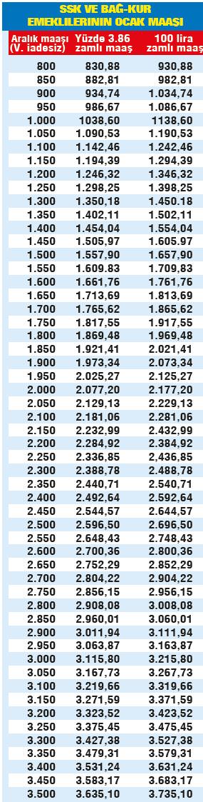 SSK ve Bağ-Kur emeklileri, bu ay maaşlarını çifte zamlı alıyor. Ocak maaşlarında yüzde 3.86 enflasyon zammı ve 100 lira seyyanen artış bulunuyor. Maaş ödemeleri devam ediyor. Emekliler, yeni maaşlarını tablolarımızdan öğreniyor.