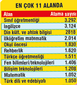 Şubat'taki 30 bin öğretmen ataması için geri sayım başladı. Milli Eğitim Bakanlığı, branş dağılımını açıkladı. En fazla atama, sınıf, İngilizce ile din kültürü ve ahlak bilgisi öğretmenliğine yapılacak. 3 bin 292 sınıf, 3 bin 124 İngilizce, 2 bin 818 din kültürü ve ahlak bilgisi öğretmeni ataması olacak.