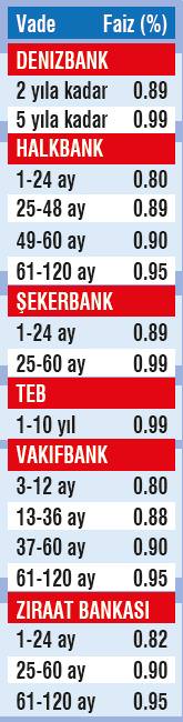 Ziraat Bankası, dün, değişik vadelerdeki konut kredisi faiz oranlarını yüzde 1'in altına düşürdü. Banka, konut kredisi faiz oranlarını 1-24 ay vadelerde yüzde 0.82'ye, 25-60 ay vadelerde yüzde 0.90'a ve 61-120 ay vadelerde de yüzde 0.95'e çekti. Ziraat'in ardından DenizBank'tan da "Konut finansmanında faizi 2 yıla kadar vadede yüzde 1.14'ten dün sabah itibarıyla yüzde 0.89'a çektik. Konut finansmanında 5 yıla kadar vadede faiz yüzde 1.14'ten yüzde 0.99'a düştü" açıklaması geldi. İlk indirimi önceki gün yapan Türk Ekonomi Bankası (TEB) da dün bir indirime daha gitti. Banka, başlattığı kampanya ile faiz oranını 1 yıldan 10 yıla kadar olan tüm vadelerde yüzde 0.99 olarak belirledi. Şekerbank konut kredisi faiz oranlarını, 1-24 ay vadelerde yüzde 0.89, 25-60 ay vadelerde ise yüzde 0.99'a çekti. Halkbank ev sahibi olmak isteyenlere 1-24 ay için yüzde 0.80, 25-48 ay için yüzde 0.89, 49-60 ay için yüzde 0.90 ve 61-120 ay için yüzde 0.95 gibi faiz oranları sunduğunu duyururken; VakıfBank da 3-12 ay vadede yüzde 0.80, 13- 36 ay vadede yüzde 0.88, 37-60 ay vadede yüzde 0.90 ve 61-120 ay vadede yüzde 0.95 faiz oranıyla kredi kullandıracağını açıkladı.