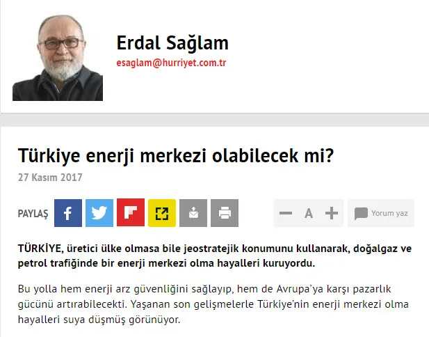 Hiçbir olayda milli duruş sergileyemeyen Hürriyet'in yazarı Erdal Sağlam, bugünkü yazısında Türkiye'nin hayallerinin suya düştüğünü ve artık enerji merkezi olamayacağımızı büyük bir sevinçle kaleme almıştı.