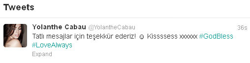 Ha geldi, ha gelecek derken yengeden Türkçe tweet geldi. Galatasaray'ın haftalardır peşinde koştuğu Hollandalı yıldız Wesley Sneijder'in eşi Yolanthe Cabau kendi Twitter hesabından Türkiye'ye mesaj gönderdi. İşte Cabau'nun tweeti;