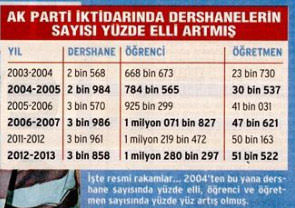 2004 ile 2013 yılı arasında dershane, öğrenci ve öğretmen sayısındaki müthiş artış, AK Parti hükümetinin iddia edildiği gibi cemaati bitirmek için dershaneleri kapatmak istediği iddiasının yalan olduğunu gözler önüne seriyor. (Yeni Akit)