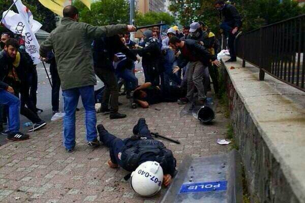Bu sırada yaralanan bir çevik kuvvet polisi kanlar içinde kaldı. Yaralı polis memurunun yardımına arkadaşları yetişti. Arkadaşlarının yardımıyla olayların yaşandığı bölgeden uzaklaştırılan polis memuru hastaneye götürüldü.
